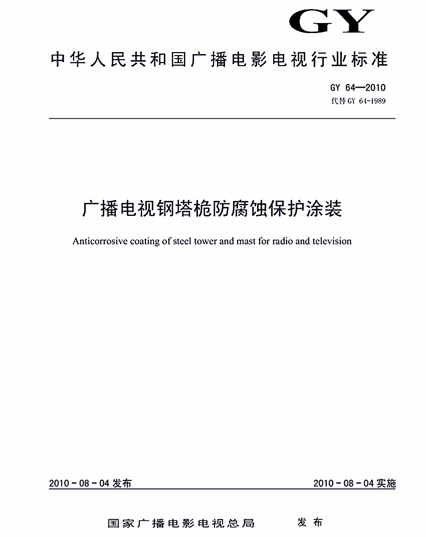 GY 中華人民共和國廣播電影電視行業標準 GY 64-2010 代替 GY 64-1989 廣播電視鋼塔桅防腐蝕保護涂裝Anticorrosive coating of steel tower and mast for radio and television