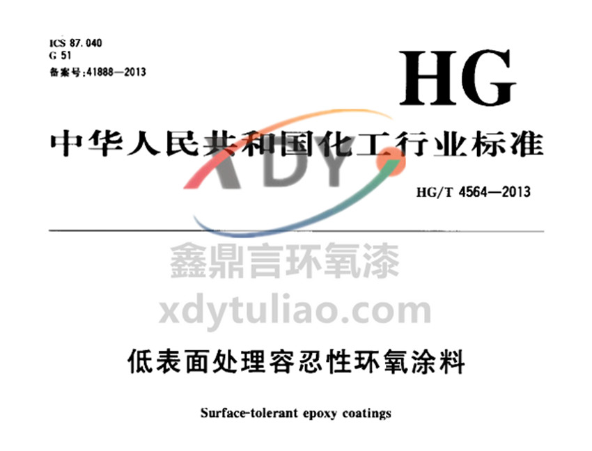 HG/T 4564-2013低表面處理容忍性環氧涂料。本標準規定了低表面處理容忍性環氧涂料的要求、試驗方法、檢驗規則及標志、包裝和貯存等內容。 本標準適用于鑫鼎言低表面處理容忍性環氧涂料,這類涂料用于非理想狀態表面(包括不能徹底除銹、高壓水噴射、濕噴砂或附著良好的舊漆膜等表面)時,尚能保持較好的性能。