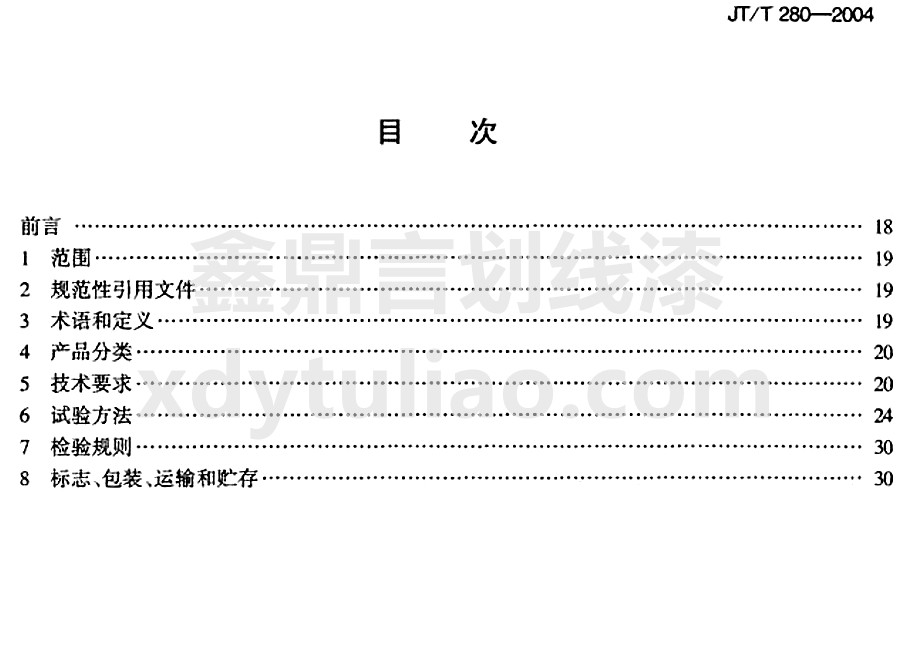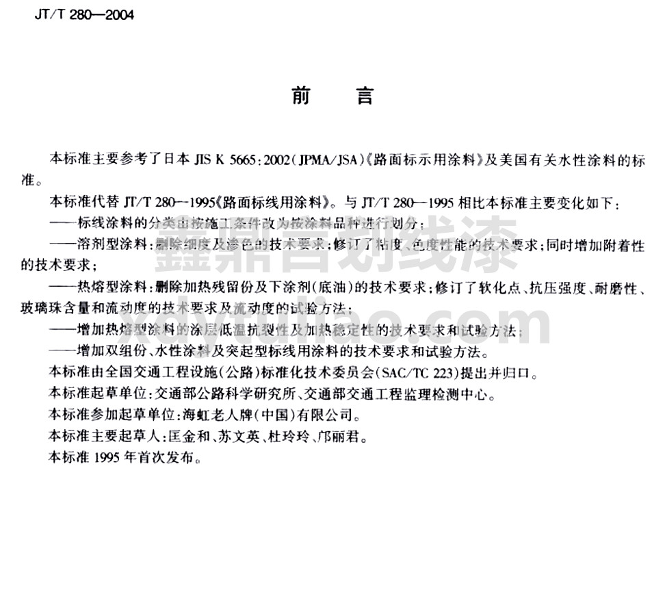 JT/T 280-2004路面標線涂料標準是小編照搬JT/T 280-2004《路面標線涂料》紙質版內容,大家可以放心參考。更多防腐涂料執行國家和行業標準等防腐涂料相關信息可以參與網站:www.zzdh88.cn
