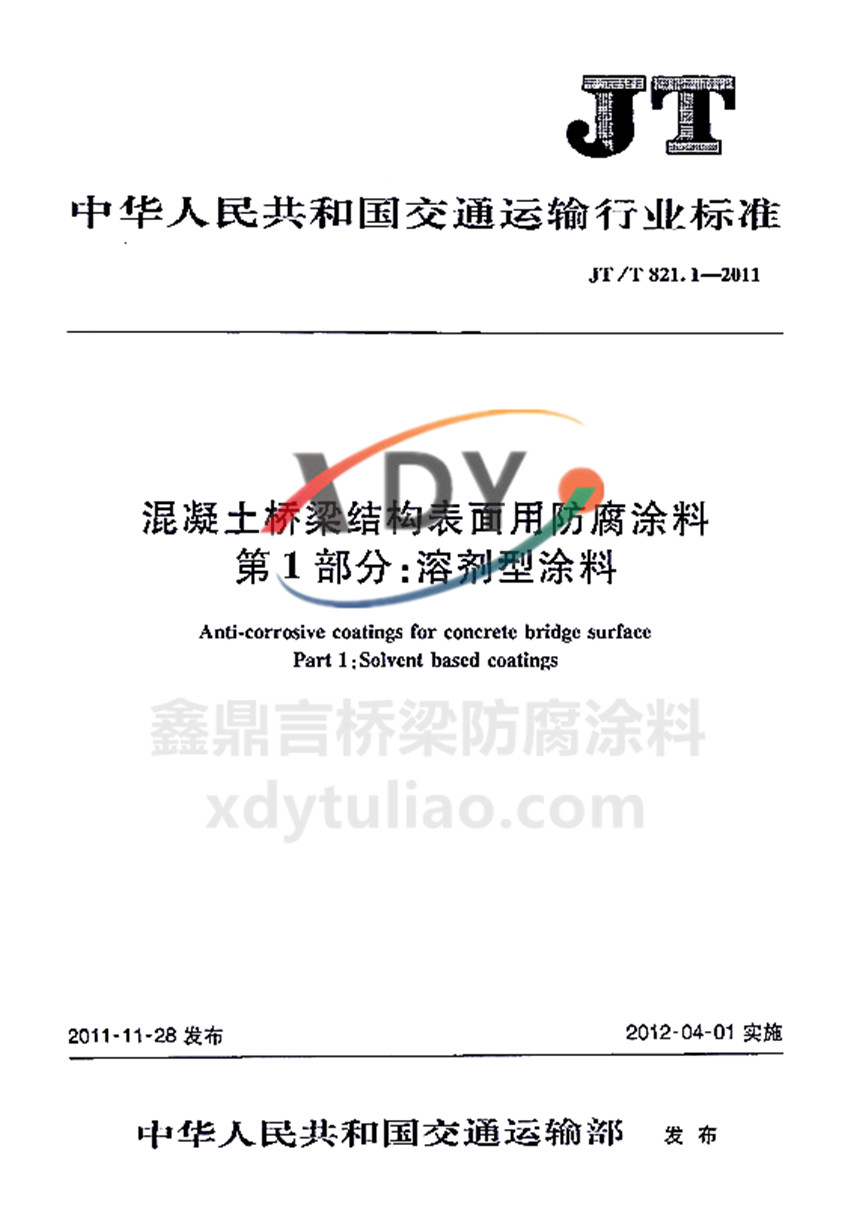 混凝土橋梁結構表面用防腐涂料 第1部分:溶劑型涂料JT/T821.1-2011 中華人民共和國交通運輸行業標準 JT/T821.1-2011 混凝土橋梁結構表面用防腐涂料 第1部分:溶劑型涂料 Anti-corrosive coatings for concrete bridge surface Part 1:Solvent based coatings 2011-11-28發布 2012-04-