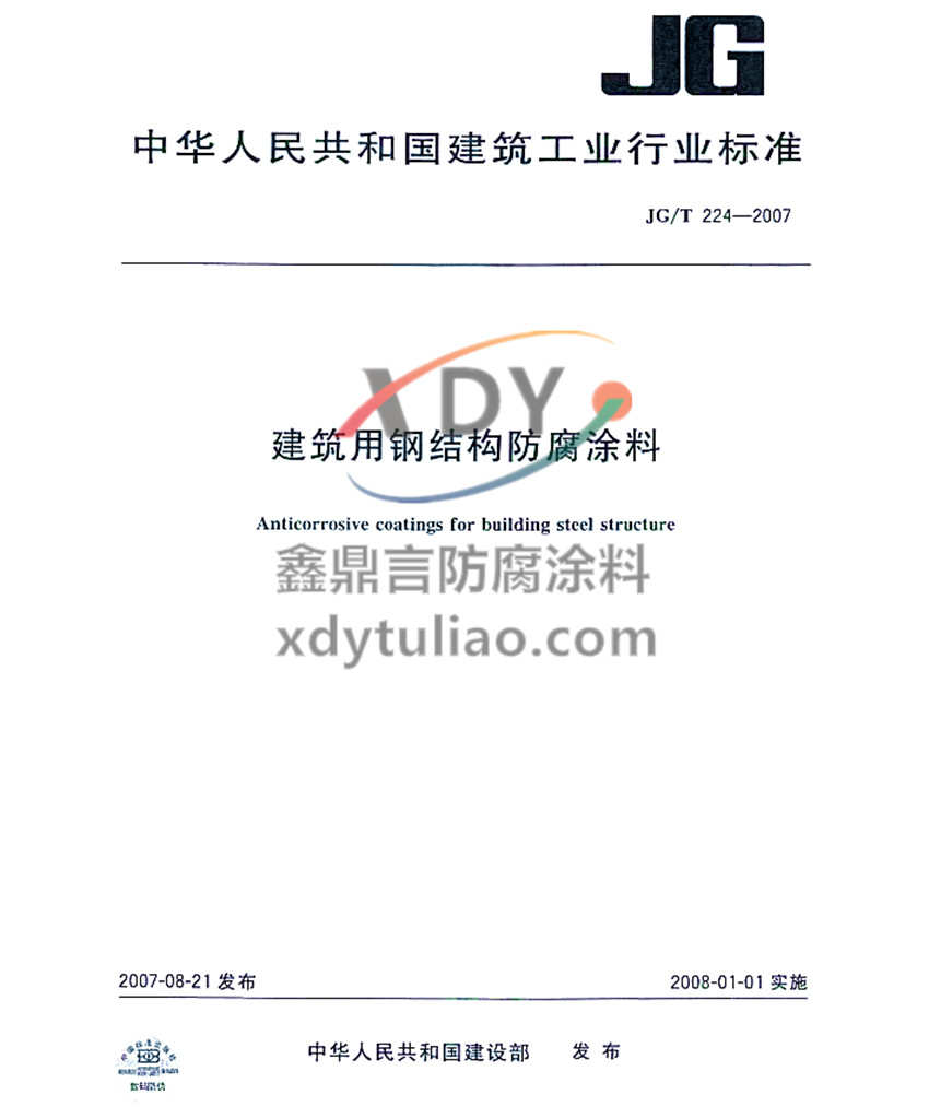 JG/T 224-2007建筑用鋼結構防腐涂料標準 中華人民共和國建工業行業標準 JG/T 224-2007 建筑用鋼結構防腐涂料Anticorrosive coatings for building steel structure 2007-08-21發布 2008-01-01實施 中華人民共和國建設部發布 本標準規定了建筑用鋼結構防腐涂料的分類、技術指標、試驗方法、檢驗規則及標志、包裝、運輸、