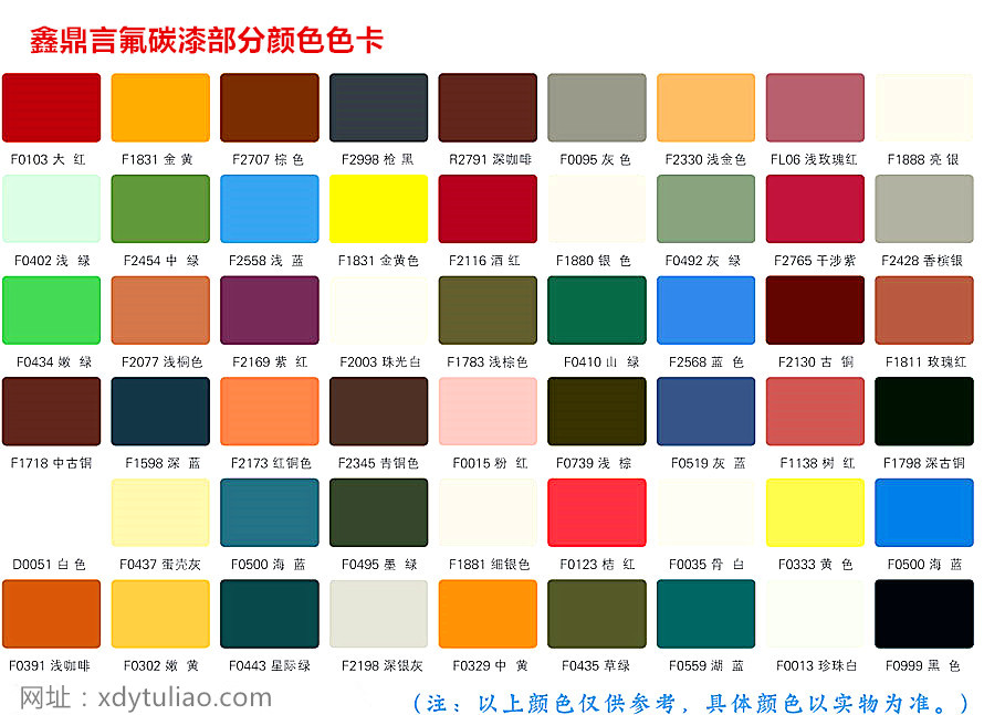 氟碳漆顏色有很多種,光澤上分為亮光,平光,啞光,無光;常用的金屬色氟碳漆顏色有:金色、銀白色、銀灰色,香檳銀、藍銀等,常用的氟碳漆實色有:大紅色、灰色、白色、中綠色、中黃色、藍色、紫色、桔紅色、黑色、酒紅色、棕色等。客戶可以選擇氟碳漆色卡有:歐標RAL色卡(RAL國際色卡、勞爾色卡)、博凱氟碳漆色卡、國標GSB漆膜顏色標準色卡(GSB05-1426-2001)、金屬漆色卡。客戶可以根據底材